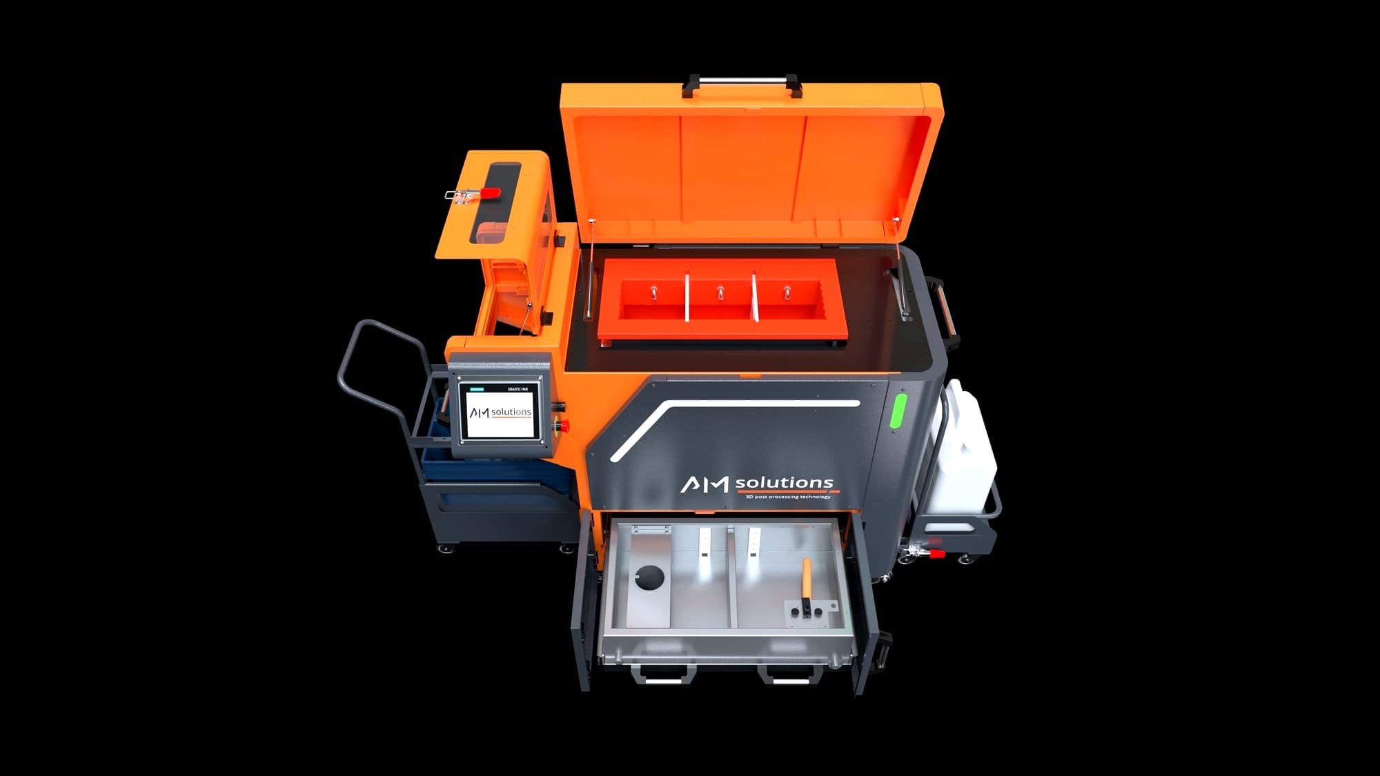 Other new features include a redesigned processing trough with end-side profiling and extra partitions, and a new separation concept that shifts media/part separation onto a dedicated material cart for smoother workflow and higher throughput. Additionally, AM Solutions has integrated a settling tank and modern HMI with intuitive menu navigation, while also designing the platform to emit low levels of noise.