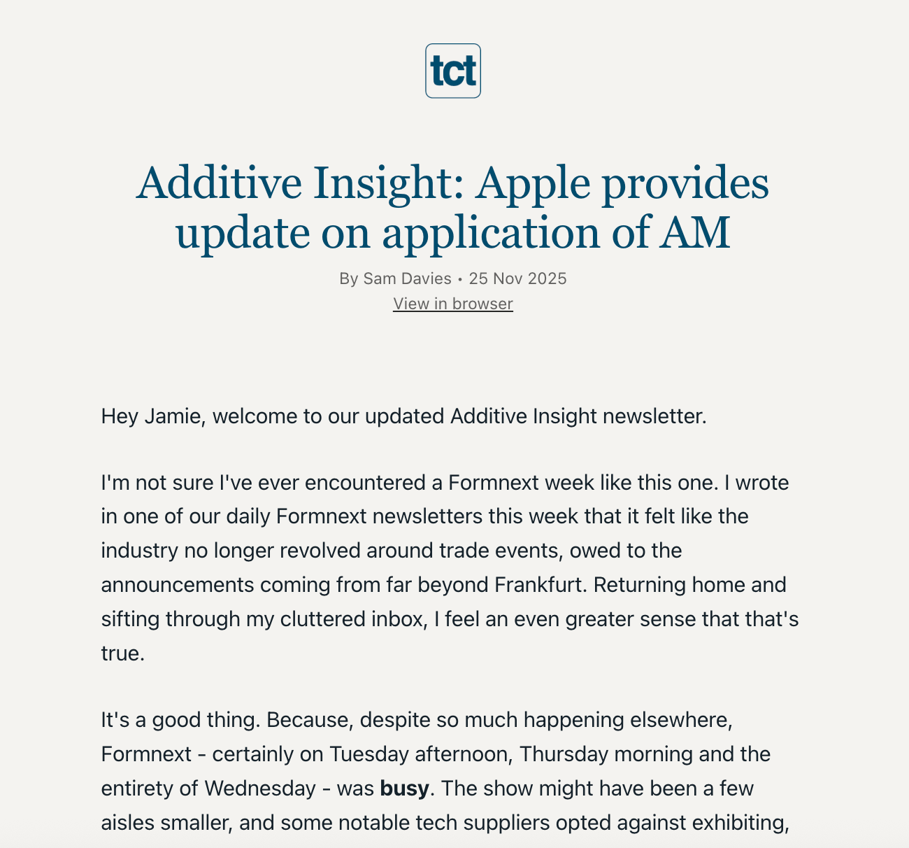 TCT’s inbox audience isn’t broad or generic — it’s made up of thousands of specialists inside the sectors where additive is scaling fastest.